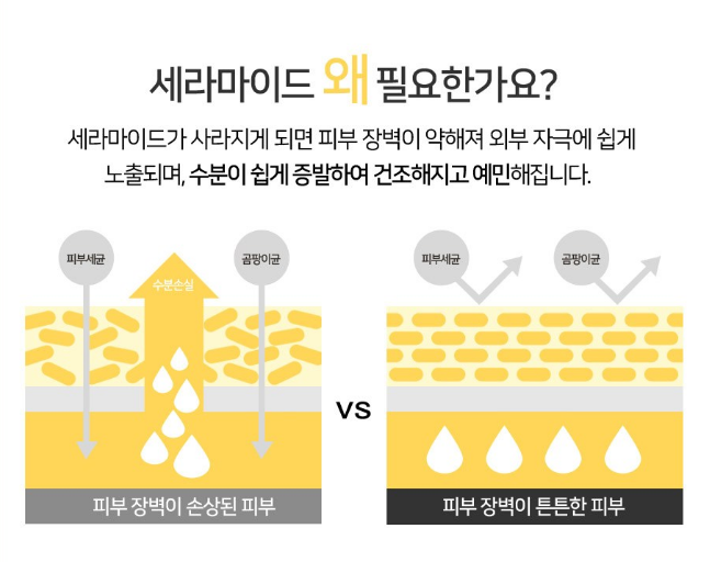 세라마이드가 사라지게 되면 피부 장벽이 약해져 외부 자극에 쉽게 노출되며, 수분이 쉽게 증발하여 건조하고 예민해져요.