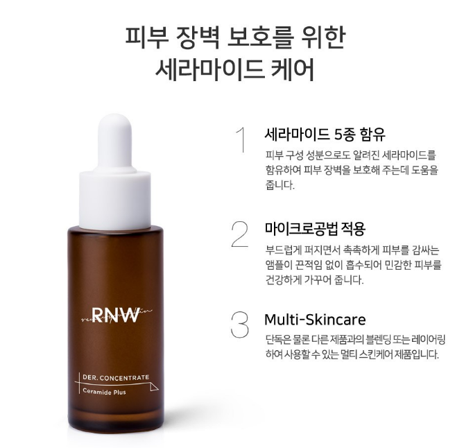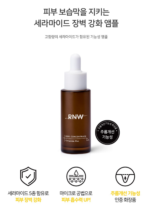 알엔더블유 더 컨센트레이트 세라마이드 플러스는 세라마이드 5종 함유로 피부 장벽 강화를 돕고, 마이크로 공법으로 피부 흡수력을 높여주는 주름개선 기능성 인증 화장품이에요.