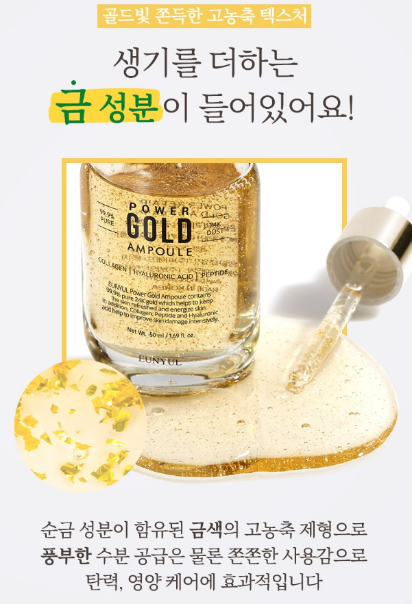 순금 성분이 함유된 금색의 고농축 제형으로 풍부한 수분 공급은 물론 쫀쫀한 사용감으로 탄력, 영양 케어에 효과적이에요.