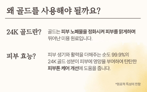 24K 골드는 피부 노폐물을 정화시켜 피부를 맑게하는 뛰어난 미용 원료예요. 피부 생기와 활력을 더해주는 99.9%의 24K 골드 성분이 피부에 영양을 부여하여 탄탄한 피부톤 케어 개선에 도움을 준답니다:)