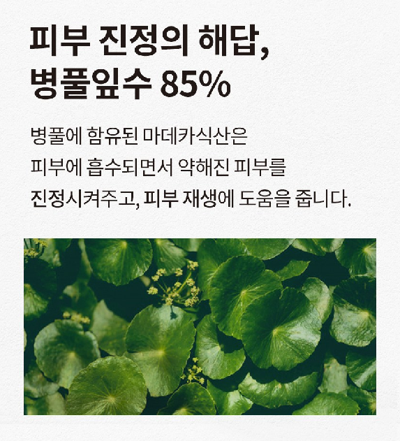 병풀에 함유된 마데카식산은 피부에 흡수되면서 약해진 피부를 진정시켜주고, 피부 재생에 도움을 줘요. 이 병풀잎수가 85% 함유되어 있답니다.