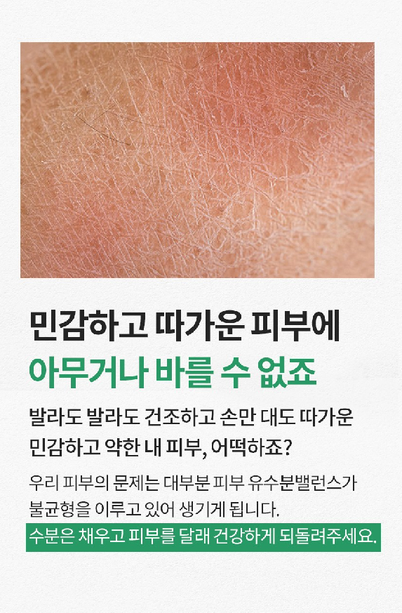 우리 피부의 문제는 대부분 피부 유수분밸런스가 불균형을 이루고 있어 생기게 돼요. 수분은 채우고 피부를 달래 건강하게 되돌려주어야하지요.