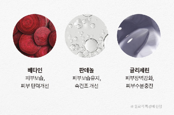 베타인은 피부보습과 피부 탄력개선, 판테놀은 피부보습유지와 속건조 개선, 글리세린은 피부장벽강화 및 피부수분 충전에 도움을 준답니다.