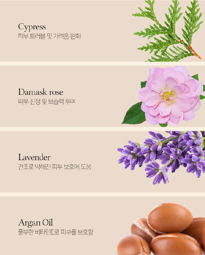 피부 트러블 및 가려움 완화를 돕는 사이프러스, 피부 진정 및 보습력을 부여해주는 다마스크장미, 건조로 약해진 피부 보호에 도움을 주는 라벤더, 풍부한 비타민E로 피부를 보호하는 아르간 오일이 함유되어 있답니다!