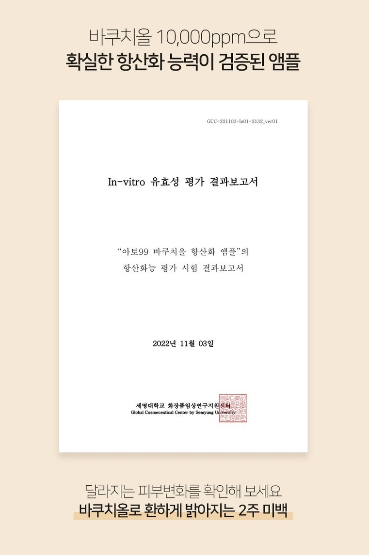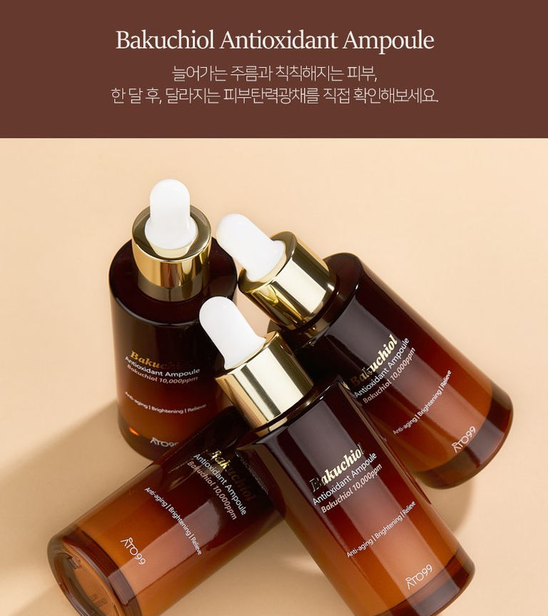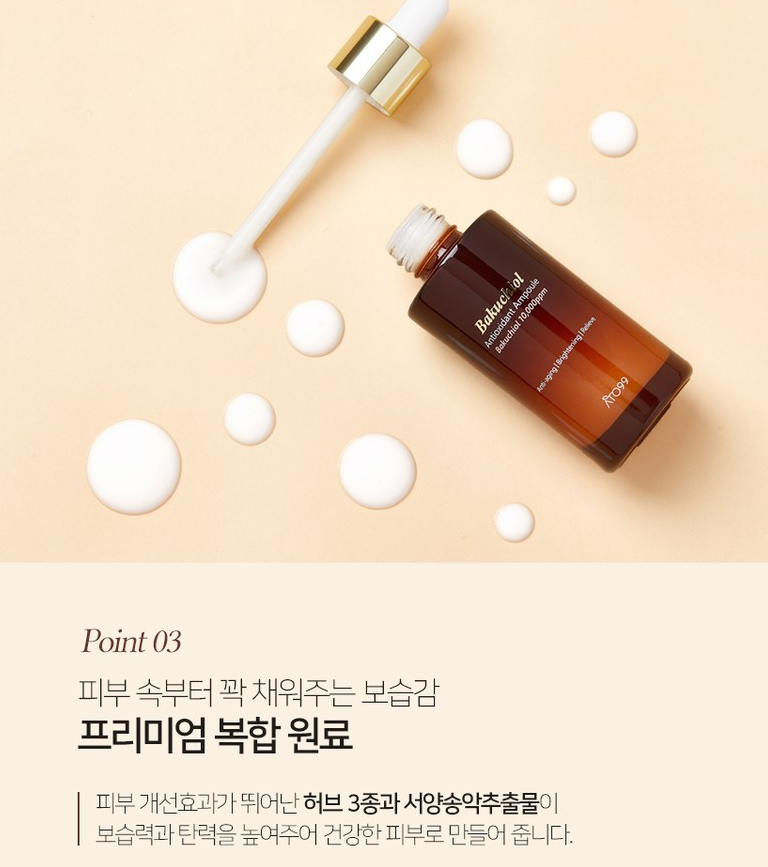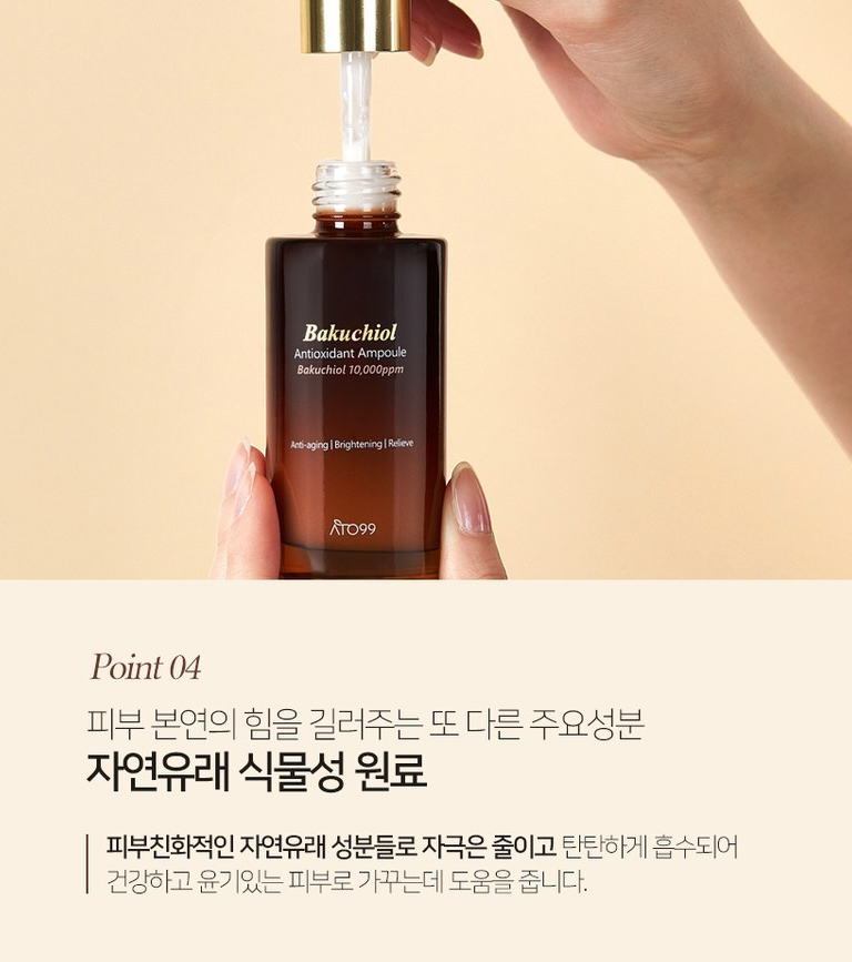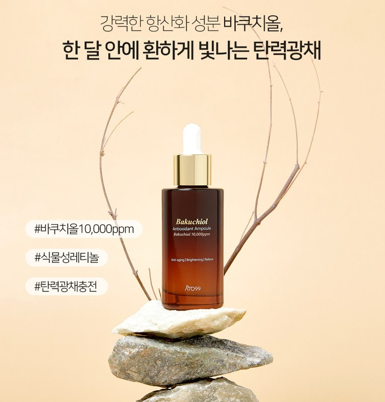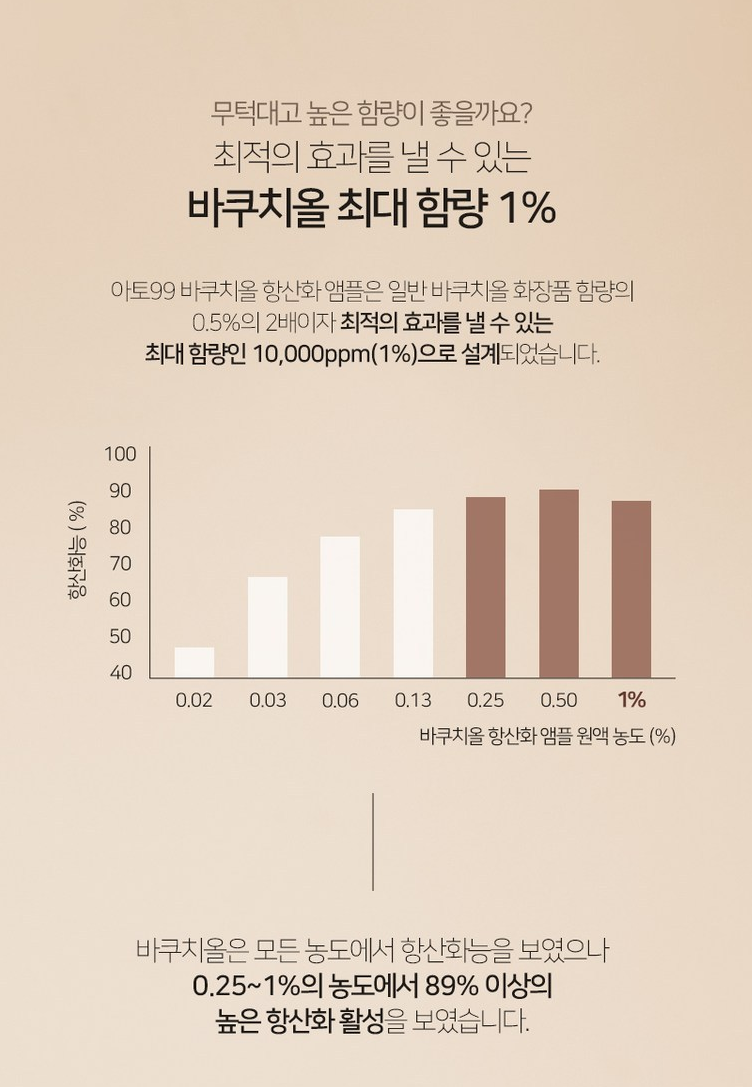 아토99 바쿠치올 앰플은 일반 바쿠치올 화장품 함량 0.5%의 2배이자 최적의 효과를 낼 수 있는 최대 함량인 10,000ppm(1%)로 설계되었어요. 또한 바쿠치올은 0.25~1%의 농도에서 89%이상의 높은 항산화 활성을 보였다고 해요.