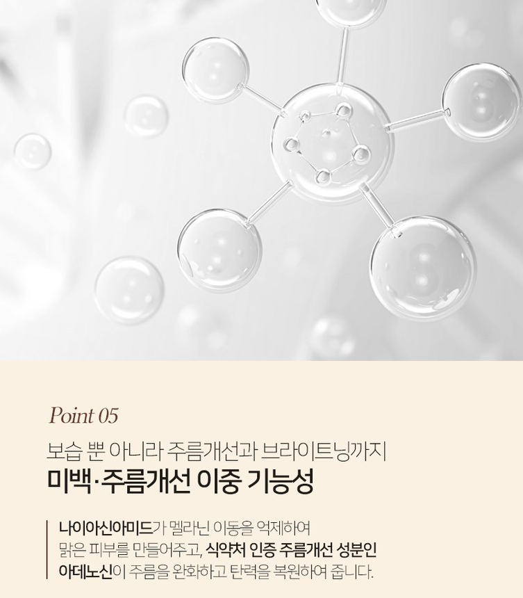 나이아신아미드가 멜라닌 이동을 억제하여 맑은 피부를 만들어주고, 식약처 인증 주름개선 성분인 아데노신이 주름을 완화하고 탄력을 복원하여 주기 때문에 미백 및 주름개선 이중 기능을 해준답니다.