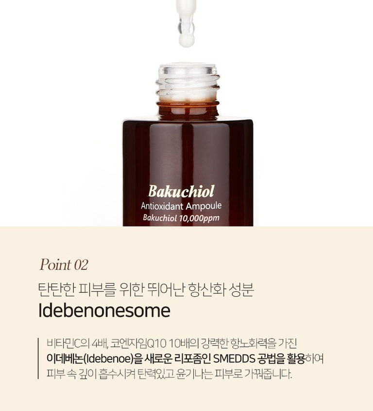 강력한 항산화 성분 바쿠치올이 10,000ppm 함유되어있어 한 달 안에 환하게 빛나는 탄력광채를 느껴보실 수 있을 거예요!