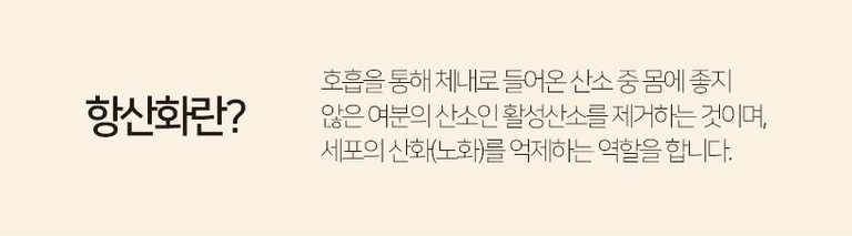 그렇다면 항산화란 무엇일까요? 항산화란 호흡을 통해 체내로 들어온 산소 중 몸에 좋지 않은 여분의 산소인 활성산소를 제거하는 것이며, 세포의 산화(노화)를 억제하는 역할을 해요.