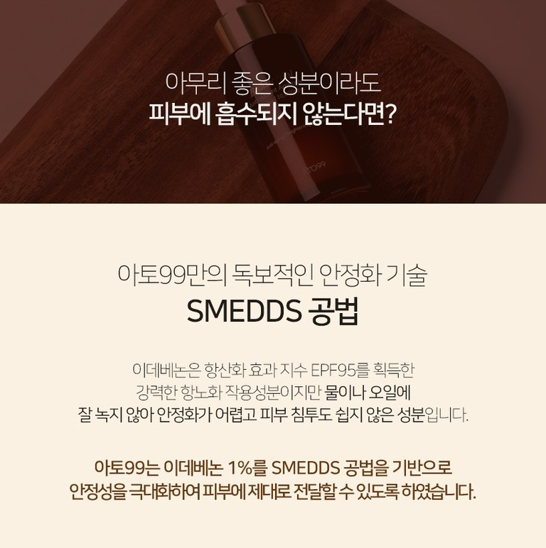 아무리 좋은 성분이라도 피부에 흡수되지 않는다면 아무 소용 없겠지요. 이데베논은 항산화 효과 지수 EPF95를 획득한 강력한 항노화 작용성분이지만 물이나 오일에 잘 녹지 않아 안정화가 어렵고 피부 침투도 쉽지 않아요. 아토99은 이데베논 1%를 SMEDDS 공법을 기반으로 안정성을 극대화하여 피부에 제대로 전달할 수 있도록 했어요.
