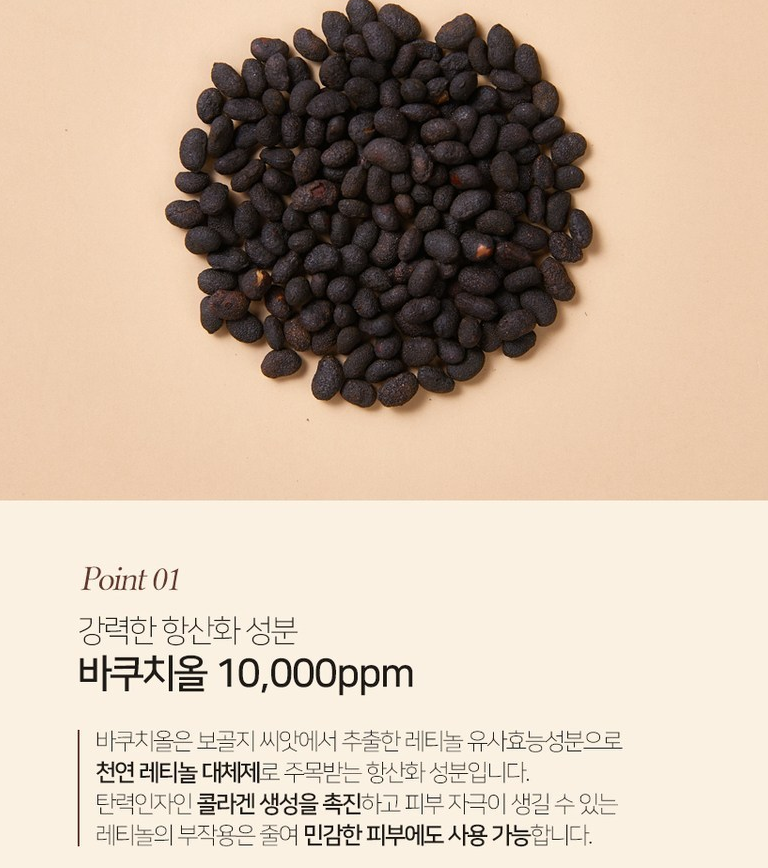 바쿠치올은 보골지 씨앗에서 추출한 레티놀 유사효능성분으로 천연 레티놀 대체제로 주목받는 항산화 성분인데요. 탄력인자인 콜라겐 생성을 촉진하고 피부 자극이 생길 수 있는 레티놀의 부작용은 줄여 민감한 피부에도 사용 가능하답니다!