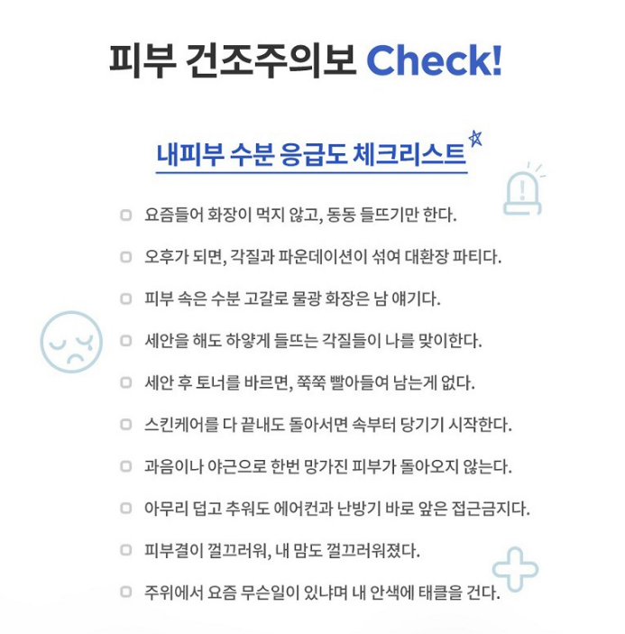 위 리스트는 피부 수분 응급도 체크리스트예요. 해당되는 것을 체크해보시고 7개 이상이라면 극건조, 3개~6개라면 극건조 주의, 2개 이하면 건조 처방으로 알맞은 스킨 케어를 선택하시길 추천드려요~!