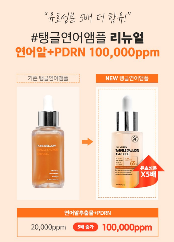 탱글연어앰플이 리뉴얼 되었어요! 기존 앰플에서의 연어알추출물+PDRN 등 유효성분이 20,000ppm에서 5배 더 함유된 100,000ppm으로 증가되었답니다.
