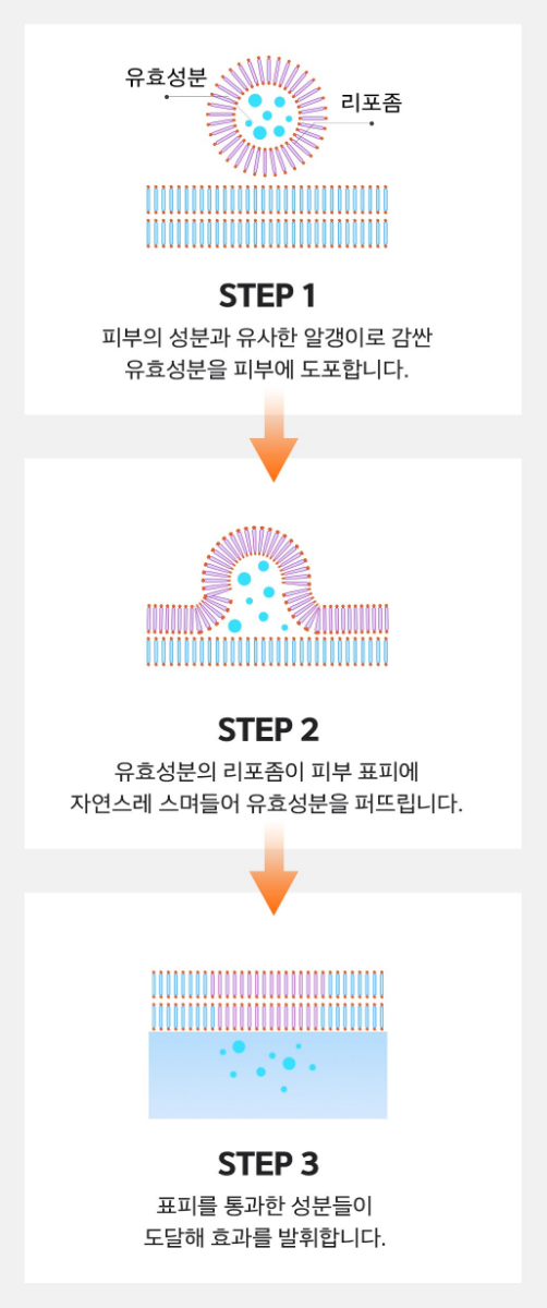 피부의 성분과 유사한 알갱이로 감싼 유효성분을 피부에 도포해요. 그리고 유효성분의 리포좀이 피부 표피에 자연스레 스며들어 유효성분을 퍼뜨리며 표피를 통과한 성분들이 도달해 효과를 발휘하는 공법이에요.