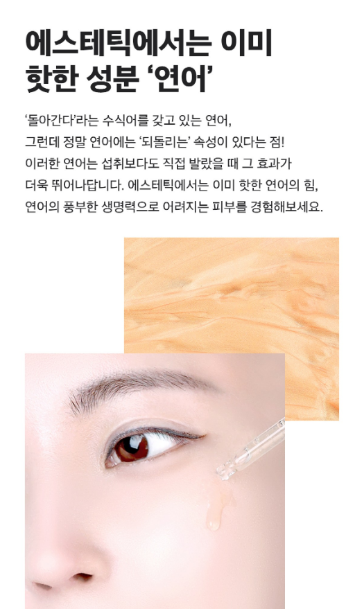 '돌아간다'라는 수식어를 갖고 있는 연어에는 정말로 되돌리는 속성이 있어요. 연어는 섭취보다도 직접 발랐을 때 그 효과가 더욱 뛰어나며 에스테틱에서는 이미 핫한 연어의 힘이에요. 이런 연어의 풍부한 생명력으로 어려지는 피부를 경험할 수 있어요.