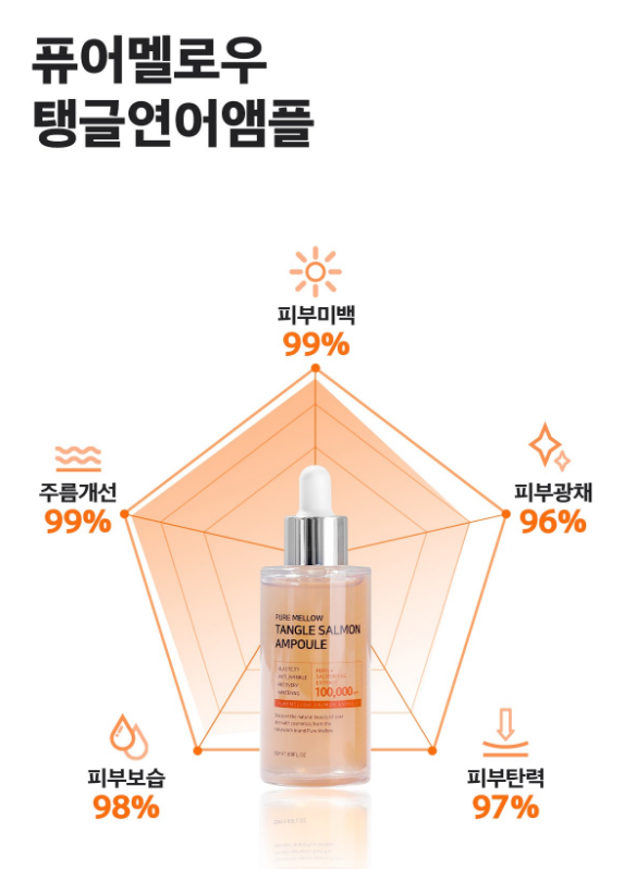 탱글연어앰플은 피부미백 99%, 피부광채 96%, 피부탄력 97%, 피부보습 98%, 주름개선 99%로 오각형 제품이에요~!