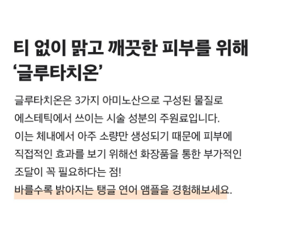 글루타치온은 3가지 아미노산으로 구성된 물질로 에스테틱에서 쓰이는 시술 성분의 주원료예요. 이는 체내에서 아주 소량만 생성되기 때문에 피부에 직접적인 효과를 보기 위해선 화장품을 통한 부가적인 조달이 꼭 필요해요. 탱글 연어 앰플로 바를수록 밝아지는 피부를 경험해보세요.
