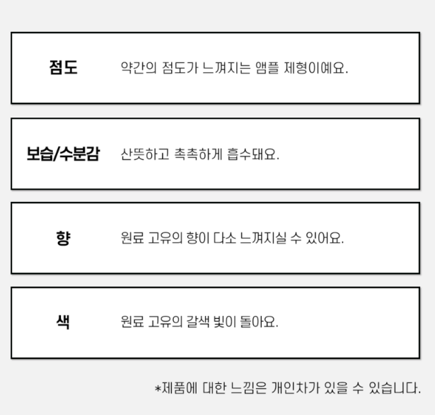 약간의 점도가 느껴지는 앰플 제형이고, 산뜻하고 촉촉하게 흡수돼요. 또, 원료 고유의 향이 다소 느껴지실 수 있으며 원료 고유의 갈색 빛이 도는 색이랍니다~