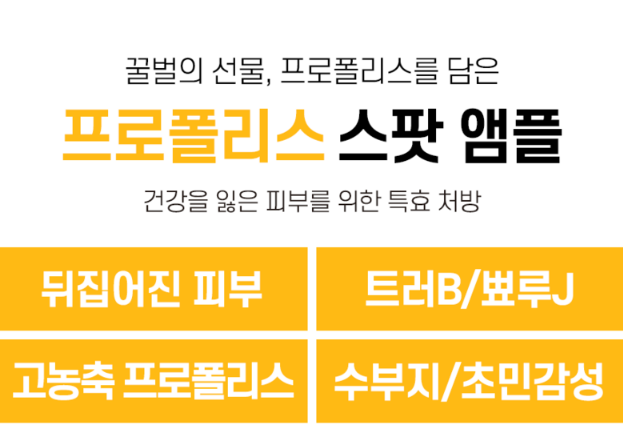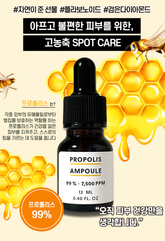 뒤집어진 피부, 트러블과 뾰루지, 수부지와 초민감성 피부 등 건강을 잃은 피부를 위한 고농축 프로폴리스가 함유된 앰플이에요!
