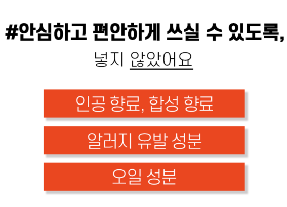 안심하고 편안하게 쓰실 수 있도록 인공 향료, 합성 향료, 알러지 유발 성분, 오일 성분은 넣지 않았어요.