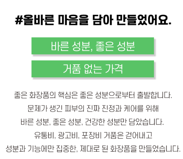 바른 성분, 좋은 성분에만 집중하여 유통비, 광고비, 포장비등 거품 없는 가격으로 제대로 된 화장품을 만들었어요.