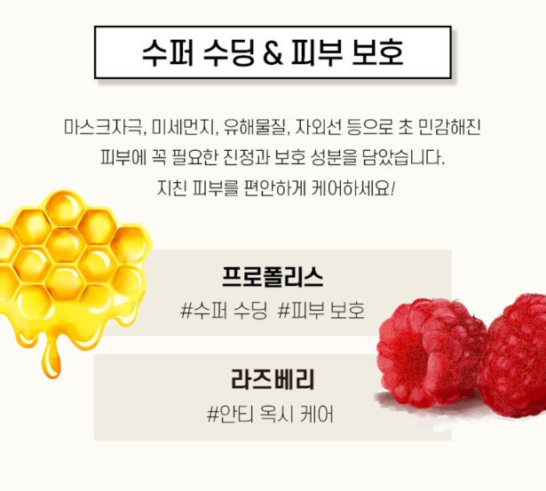 마스크자극, 미세먼지, 유해물질, 자외선 등으로 초 민감해진 피부에 꼭 필요한 진정과 보호 성분(수퍼 수딩과 피부 보호를 돕는 프로폴리스와 안티 옥시 케어를 돕는 라즈베리 등)을 담았어요. 지친 피부를 편안하게 케어해보세요~