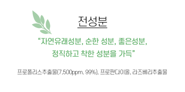 자연유래성분, 순한 성분, 좋은성분, 정직하고 착한 성분을 가득 담았어요. 프로폴리스추출물(7,500ppm, 99%), 프로판다이올, 라즈베리추출물 등이 들었어요.