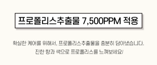 확실한 케어를 위해 프로폴리스추출물 7,500ppm으로 충분히 담아냈어요. 진한 향과 색으로 프로폴리스를 느껴보세요!