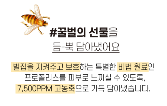 벌집을 지켜주고 보호하는 특별한 비법 원료인 프로폴리스를 피부로 느낄 수 있도록 7,500ppm 고농축으로 가득 담아낸 앰플이에요.
