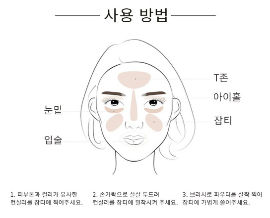 피부톤과 유사한 컬러의 컨실러를 잡티에 찍어서 손가락으로 살살 두드려 밀착 시켜준 후 파우더를 살짝 찍어 브러쉬로 가볍게 쓸어주시면 된답니다. 또, T존, 눈밑, 아이홀, 잡티, 입술 등에 비슷한 색상을 올려주시면 돼요.
