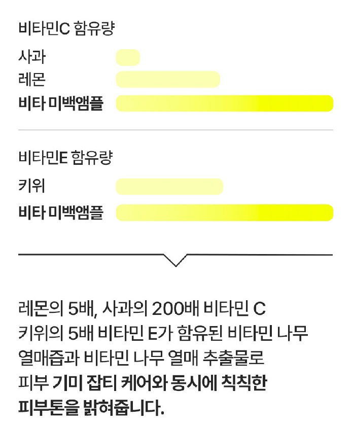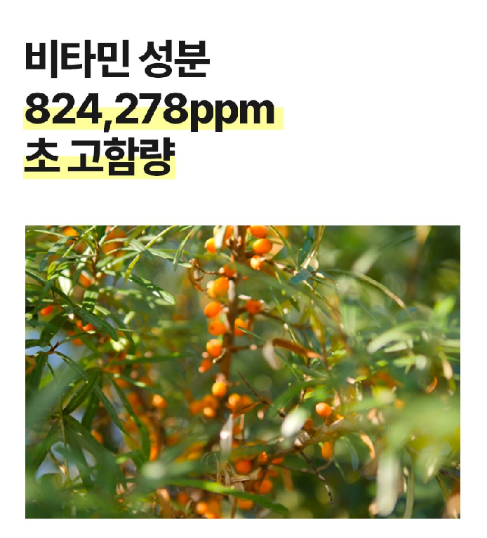 레몬의 5배, 사과의 200배 비타민 C, 키위의 5배 비타민 E가 함유된 비타민 나무 열매즙과 비타민 나무 열매 추출물로 피부 기미 잡티 케어와 동시에 칙칙한 피부톤을 밝혀줘요:)