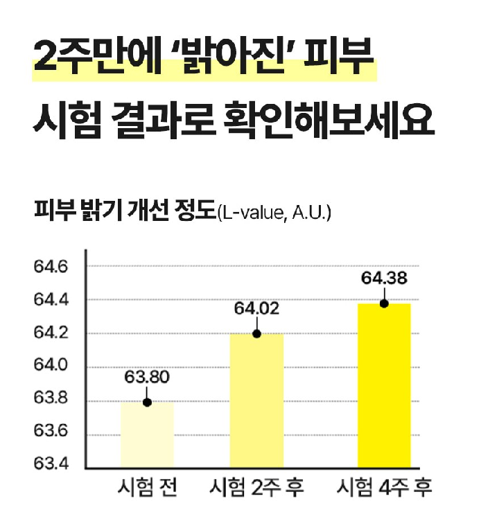 4주 동안 시험을 해본 결과 시험 전 63.80에서 2주 후 64.02, 4주 후 64.38로 피부 밝기가 개선되었어요. 개선율은 2주 후 0.35%, 4주 후 0.92%였답니다.