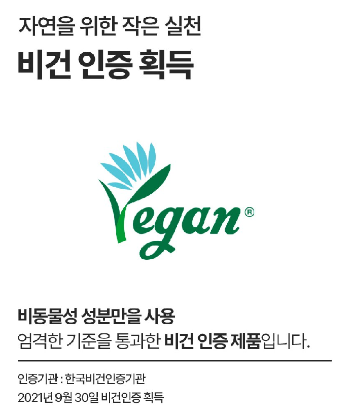 비동물성 성분만을 사용하여 엄격한 기준을 통과한 비건 인증 제품이에요!