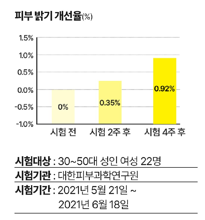 시험 2주 후부터 시험 전에 비해 통계적으로 유의한 수준(p<0.05)으로 피부 밝기가 증가하였고, 특별한 이상 반응이 관찰되지 않아 안전하며, 피부톤 개선에 도움을 준다고 판단되었어요.
