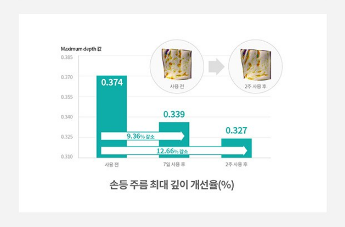 손등 주름 2주 사용 후 12.66% 감소되었어요. 우측 사진은 팔자주름 개선 사진인데요. 사용 전과 2주 사용 후 차이가 확연한 걸 보실 수 있어요.