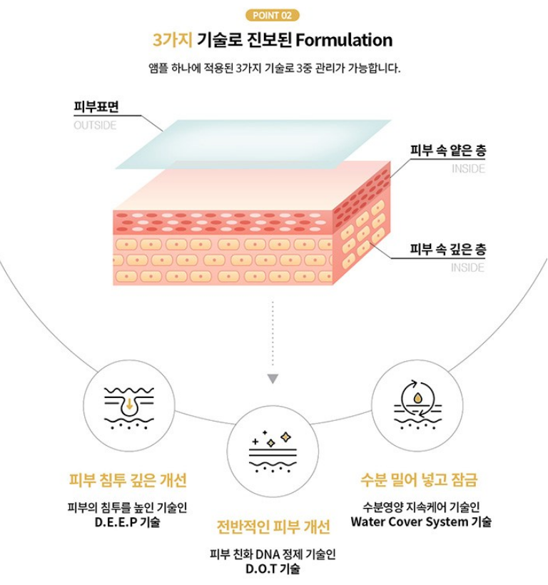 피부 침투를 높인 D.E.E.P 기술, 피부 친화 DNA 정제 기술인 D.O.T 기술, 수분영양 지속케어 기술인 Water Cover System 기술 등 앰플 하나에 적용된 3가지 기술로 3중 관리가 가능해요.