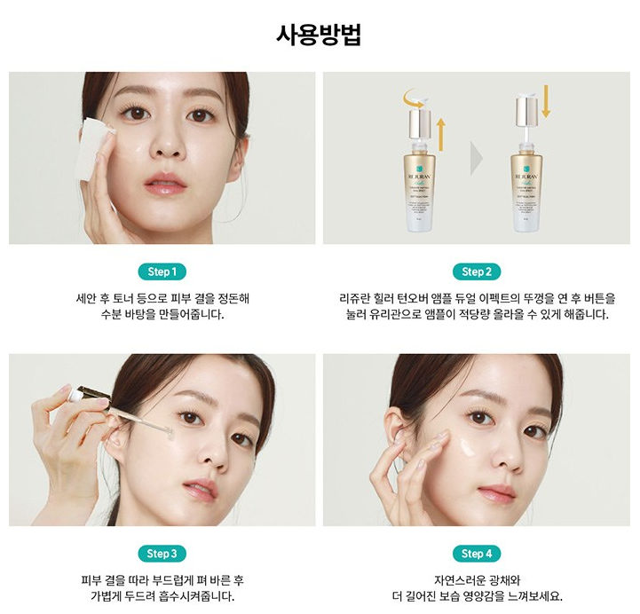 세안 후 토너 등으로 피부결을 정돈한 후 리쥬란 힐러 턴오버 앰플 듀얼 이펙트의 뚜껑을 연 후 버튼을 눌러 유리관으로 앰플이 적당량 올라올 수 있게 해줘요. 그리고 피부 결을 따라 부드럽게 펴 바른 후 가볍게 두드려 흡수시켜주시면 자연스러운 광채와 길어진 보습 영양감을 느낄 수 있어요!