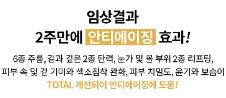 임상결과 6종 주름, 겉과 깊은 2종 탄력, 눈가 및 볼 부위 2종 리프팅, 피부 속 및 겉 기미와 색소침착 완화, 피부 치밀도, 윤기와 보습 TOTAL 개선되어 안티에이징에 도움이 된다고 밝혀졌어요!