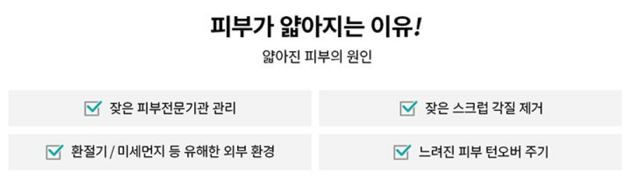 피부가 얇아지는 이유에는 잦은 피부전문기관 관리나 잦은 스크럽 각질 제거, 환절기/미세먼지 등 유해한 외부 환경 혹은 느려진 피부 턴오버 주기를 들 수 있어요.