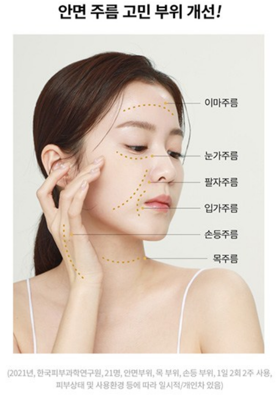이마주름, 눈가주름, 팔자주름, 입가주름, 손등주름, 목주름 등 6종 겉주름 고민 부위가 개선되었다는 결과가 있어요.