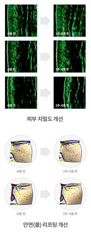 피부 치밀도, 안면(볼) 리프팅 개선, 피부 각질(턴오버) 개선 등의 기능을 돕고 있어요. 위 사진을 보시면 사용 전과 2주 사용 후 차이가 보이실 거예요.