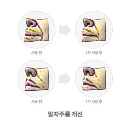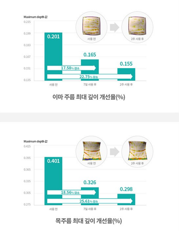 사용 2주 후 눈가 주름 19.07%, 입가 주름 22.41%, 이마 주름 22.76%, 목주름 25.61%가 감소했다는 결과가 있어요.