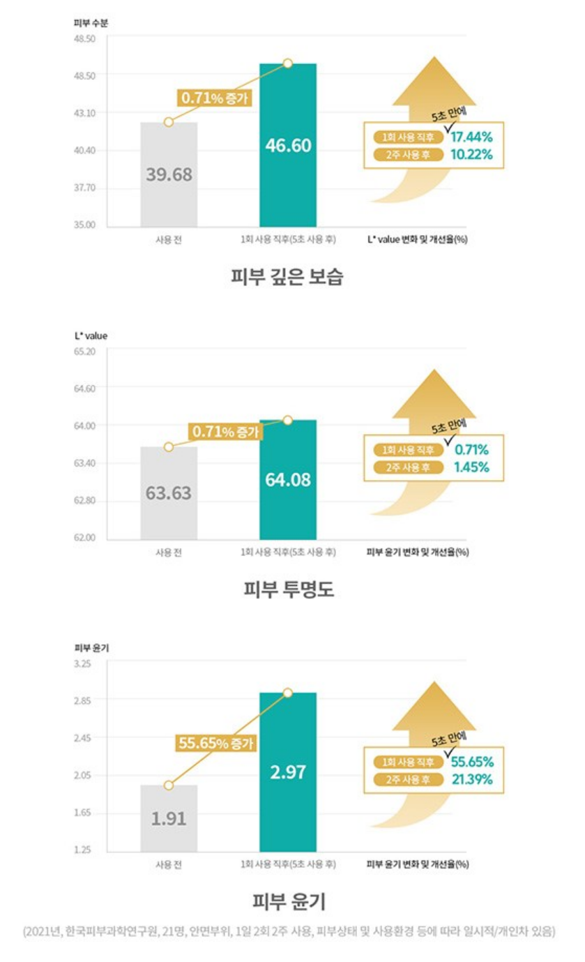 피부 깊은 보습은 사용 직후 17.44%, 2주 사용 후 10.22% 올랐고, 피부 투명도는 사용 직후 0.71%, 2주 사용 후 1.45%, 피부 윤기는 사용 직후 55.65%, 2주 사용 후 21.39% 개선되었어요.