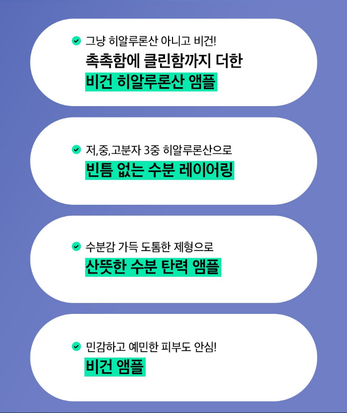 그냥 히알루론산이 아닌 촉촉함에 클린함까지 더한 비건 히알루론산 앰플이에요. 또 저, 중, 고분자 3중 히알루론산으로 빈틈 없는 수분 레이어링이 가능하며 수분감 가득 도톰한 제형으로 산뜻한 수분 탄력 앰플이에요. 마지막으로 민감하고 예민한 피부도 안심하고 사용하는 비건 앰플이랍니다~
