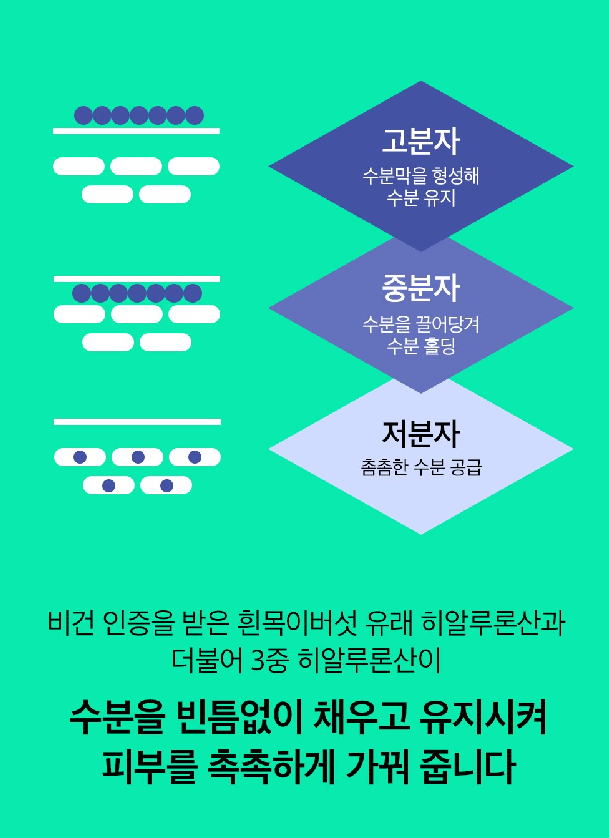 고분자는 수분막을 형성해 수분을 유지해주고, 중분자는 수분을 끌어당겨 수분 홀딩을, 저분자는 촘촘한 수분 공급을 돕는답니다. 비건 인증을 받은 흰목이버섯 유래 히알루론산과 더불어 3중 히알루론산이 수분을 빈틈없이 채우고 유지시켜 피부를 촉촉하게 가꿔줘요~