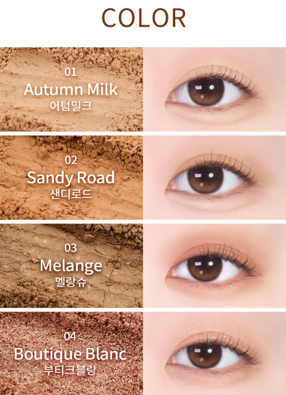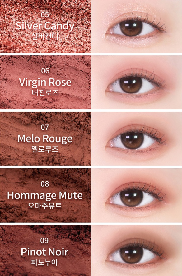 01호는 무펄 6구&매트펄 1구&글리터 2구로 구성되어 있으며 모브빛 컬러로 매혹적인 무드를 담았어요. 모브빛의 은근한 생기를 찾는 분들께 추천드려요. 또 02호는 무펄 6구&매트펄 1구&글리터 2구로 구성되어 있고 브라운 음영컬러로 감각적인 무드를 담았어요. 그윽한 한 방울 브라운 데일리 팔레트를 찾는 분들께 추천드려요 :)