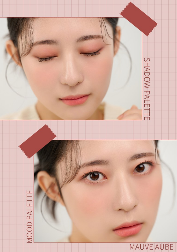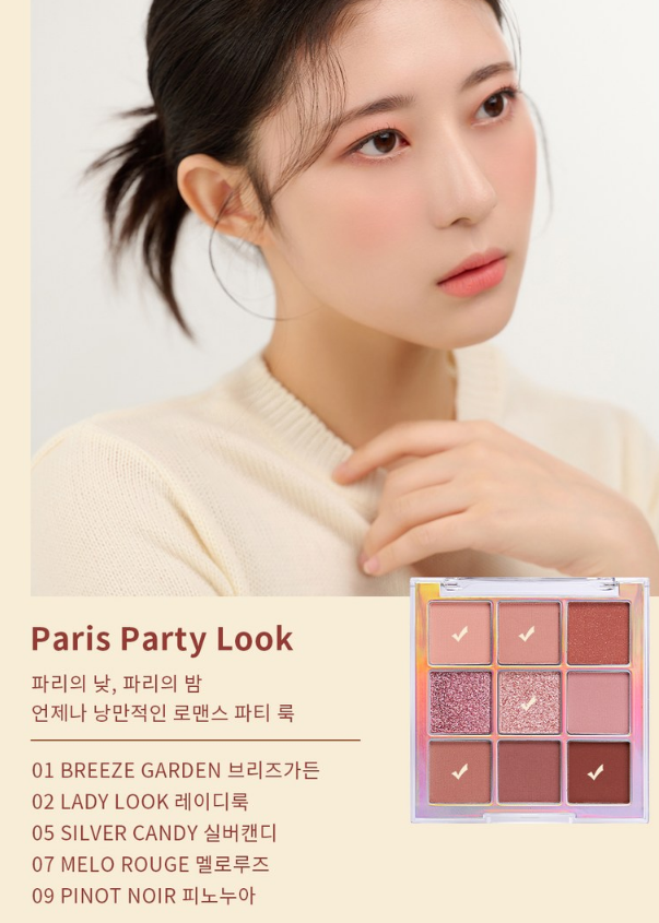 로맨스 파티 룩을 표현하려면 01호 Mauve Aube 팔레트의 브리즈가든, 레이디룩, 실버캔디, 멜로루즈, 피노누아 조합이 좋고, 센시티브 룩을 표현하려면 02호 Woody De Main 팔레트의 샌디로즈, 멜랑슈, 부티크블랑, 웨일즈우드, 더스티밤 조합이 좋아요!