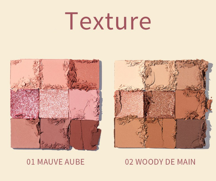 01호는 무펄 6구&매트펄 1구&글리터 2구로 구성되어 있으며 모브빛 컬러로 매혹적인 무드를 담았어요. 모브빛의 은근한 생기를 찾는 분들께 추천드려요. 또 02호는 무펄 6구&매트펄 1구&글리터 2구로 구성되어 있고 브라운 음영컬러로 감각적인 무드를 담았어요. 그윽한 한 방울 브라운 데일리 팔레트를 찾는 분들께 추천드려요 :)