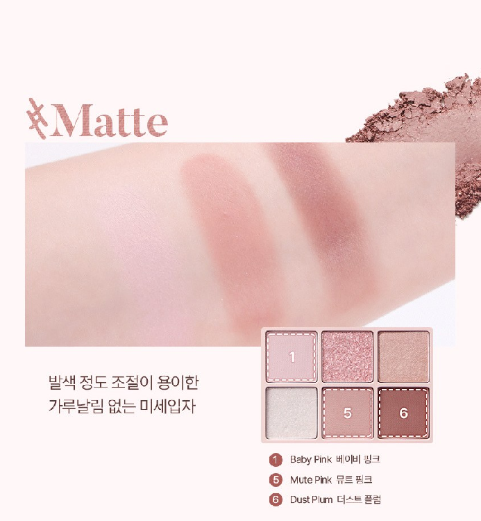 웨어러블한 차분한 핑크&모브 톤 6가지 컬러 팔레트로, 입문자도 쉽게 발색 조절이 가능한 유저빌리티 텍스쳐가 특징이에요.