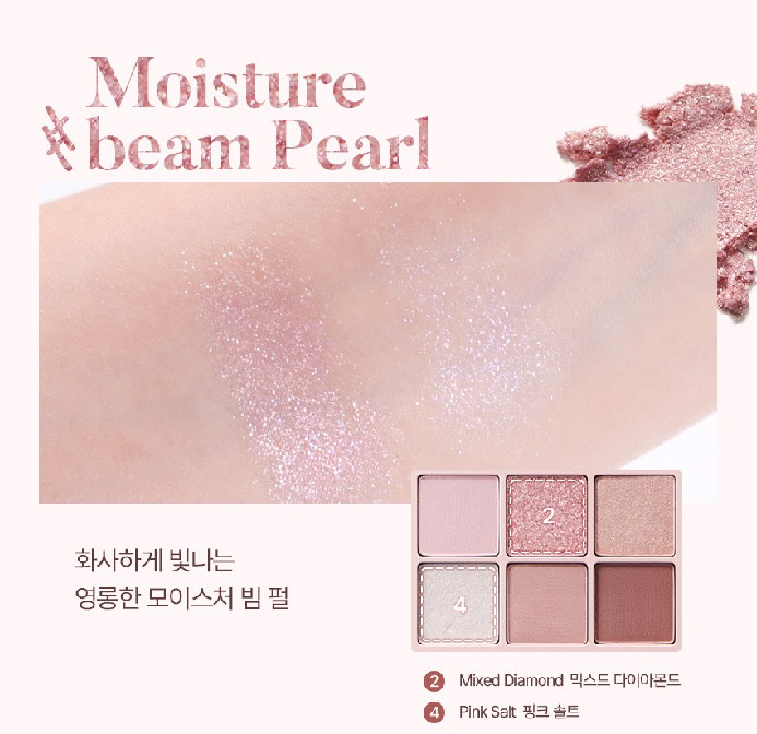 화사하게 빛나는 영롱함이 특징인 모이스처 빔 펄이에요. 믹스드 다이아몬드와 핑크 솔트가 모이스처 빔 펄 컬러예요.