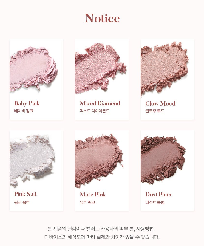 발색 정도 조절이 용이한 가루날림 없는 미세입자가 특징인 매트 타입이에요. 베이비 핑크, 뮤트 핑크, 더스트 플럼이 매트 타입 컬러들이랍니다.